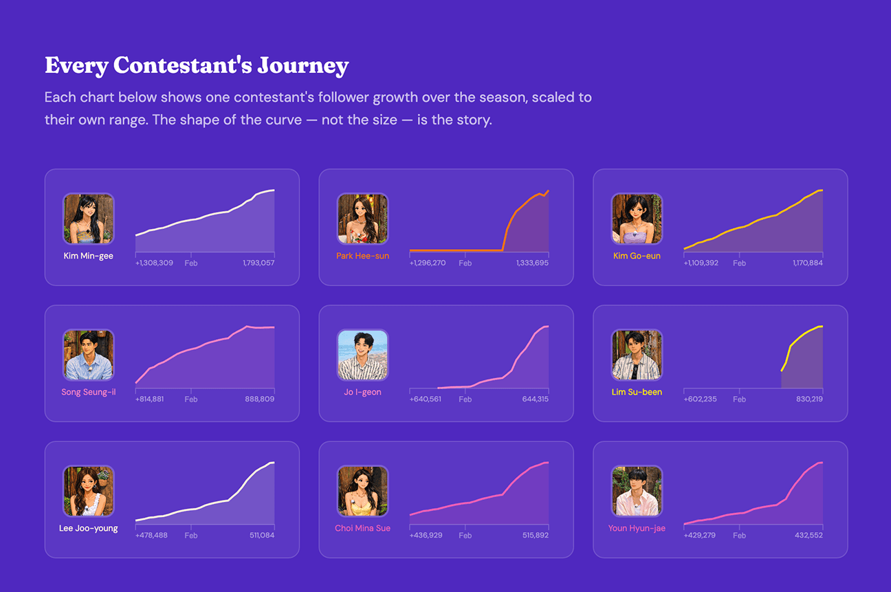 We analyze audience behavior, cultural trends, and media impact — translating complex data into clear, engaging visual stories. From reality television to streaming content and creator ecosystems, our work explores how Asian stories are consumed, shared, and experienced globally.