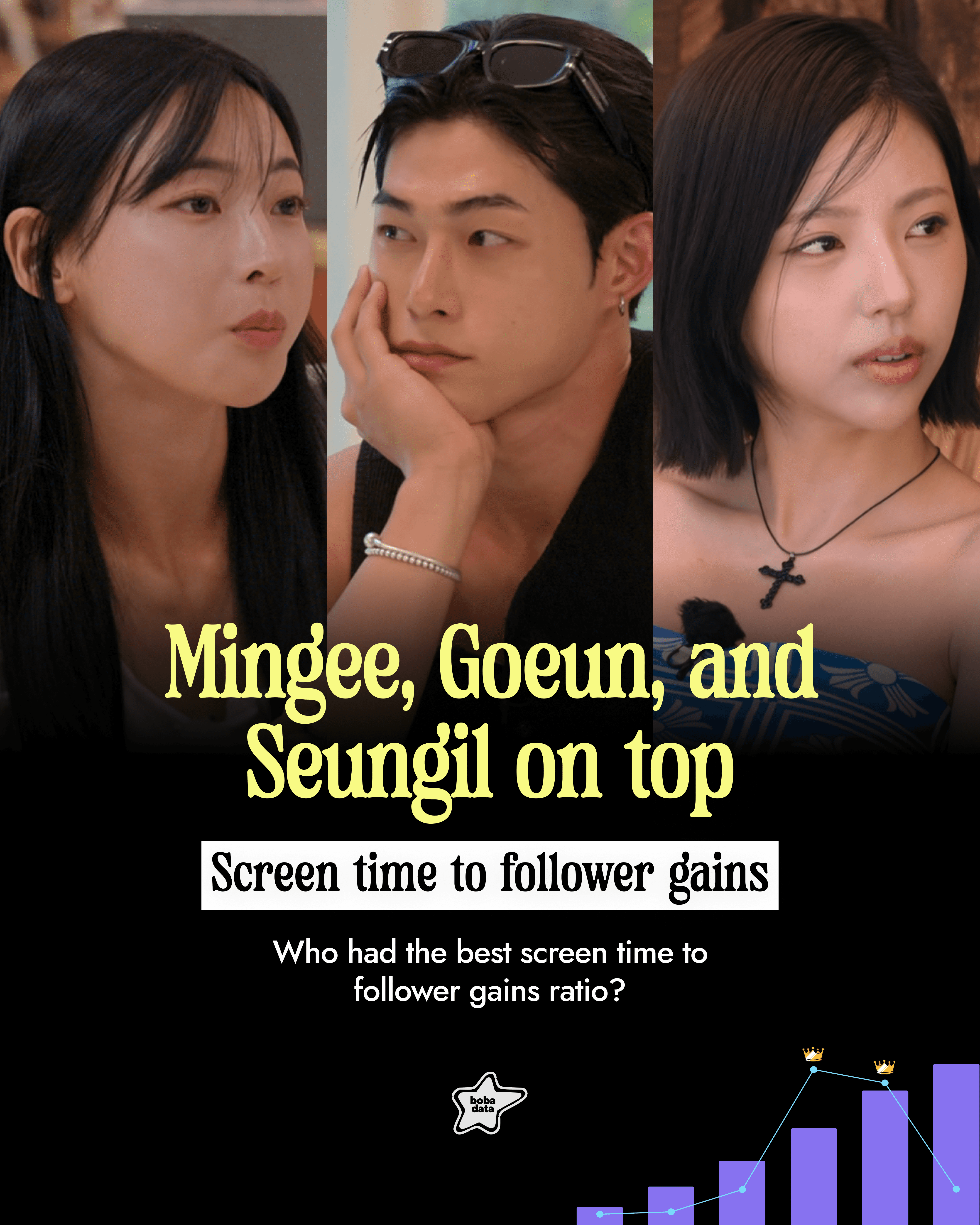 Mingee, Goeun, and Seungil have the best screen time to Instagram follower gains ratio. The ratios for men this season isn’t looking too good and Mina Sue has much less Instagram gains compared to her large screen time as she is the only contestant who has exceeded 90 minutes so far (ep 1-10). Who is your favorite of the three?